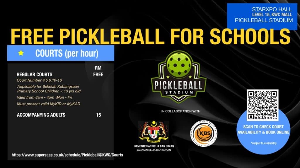 This offer is valid every weekday from 8.00 am to 4.00 pm. All 16 regular/community courts will be available for free use by primary school children on weekdays, making this the best place for kids to learn pickleball in Kuala Lumpur.