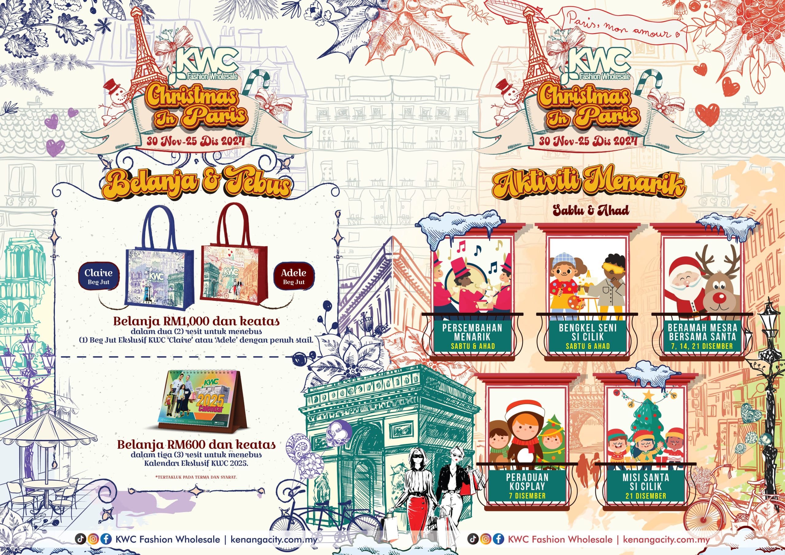Krismas KWC 2024 bakal membawa anda mengembara ke kota cinta dengan tema memukau, “Krismas di Paris”! Bayangkan keajaiban musim perayaan bertemu pesona Paris yang elegan, itulah yang menanti anda di pusat beli-belah kami. Dari hadiah eksklusif menerusi kempen Belanja & Tebus, peraduan Kostum penuh gaya bertemakan “Little Bridgerton Fantasy in Paris”, hingga