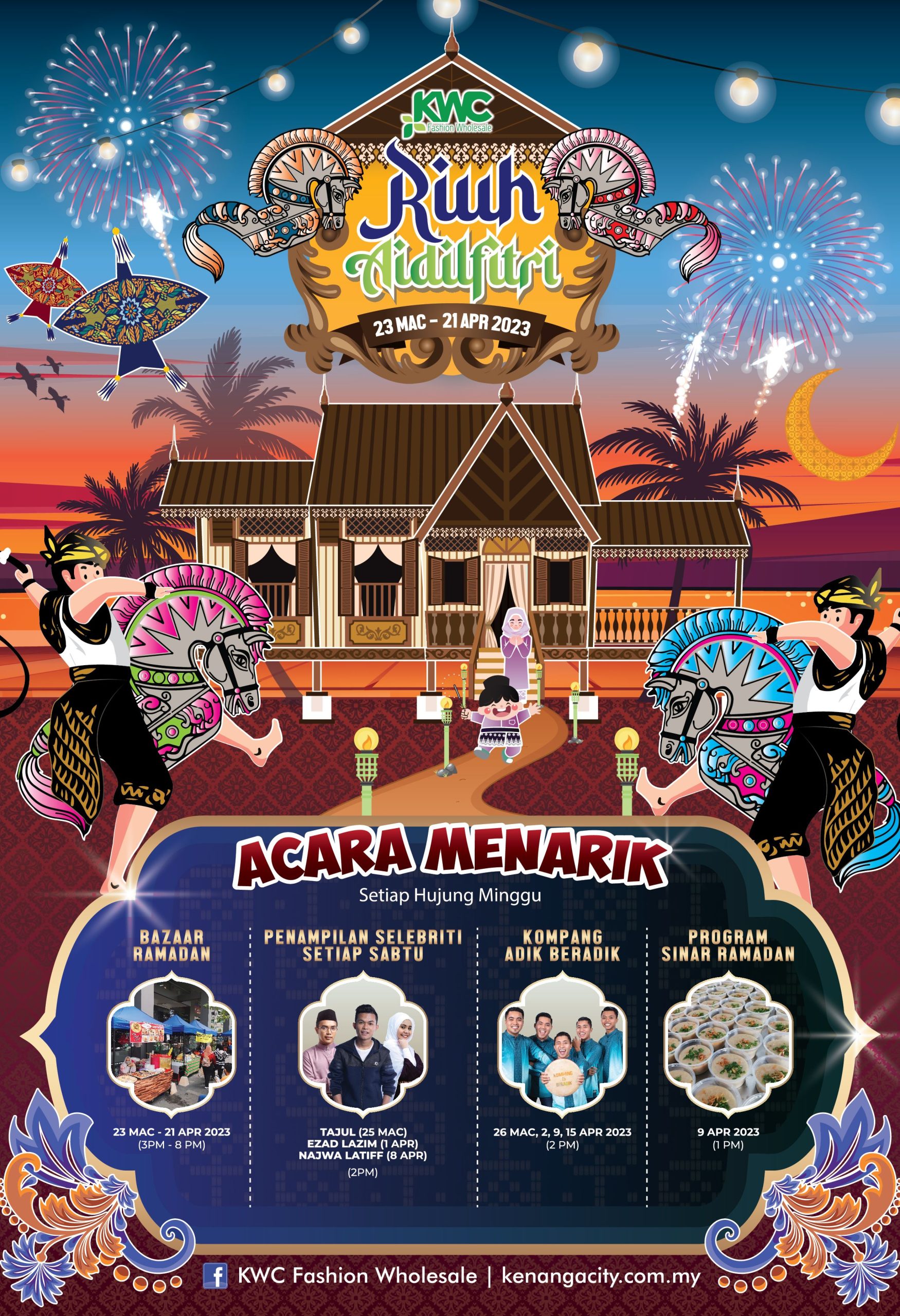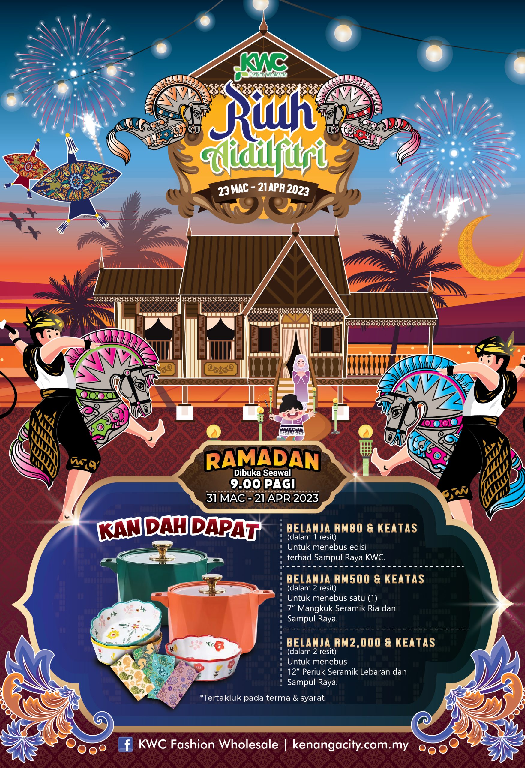 Raikan Riuh Aidilfitri di KWC Fashion Wholesale berinspirasikan dekorasi rumah limas Johor. Pengunjung dialu-alukan untuk bergambar dengan dekorasi tradisional rumah kampong sambil membeli-belah. Sepanjang Ramadan, KWC akan dibuka lebih awal, 9.00 pagi untuk kesenangan pengunjung membeli-belah bermula pada 31 Mac – 21 April 2023.